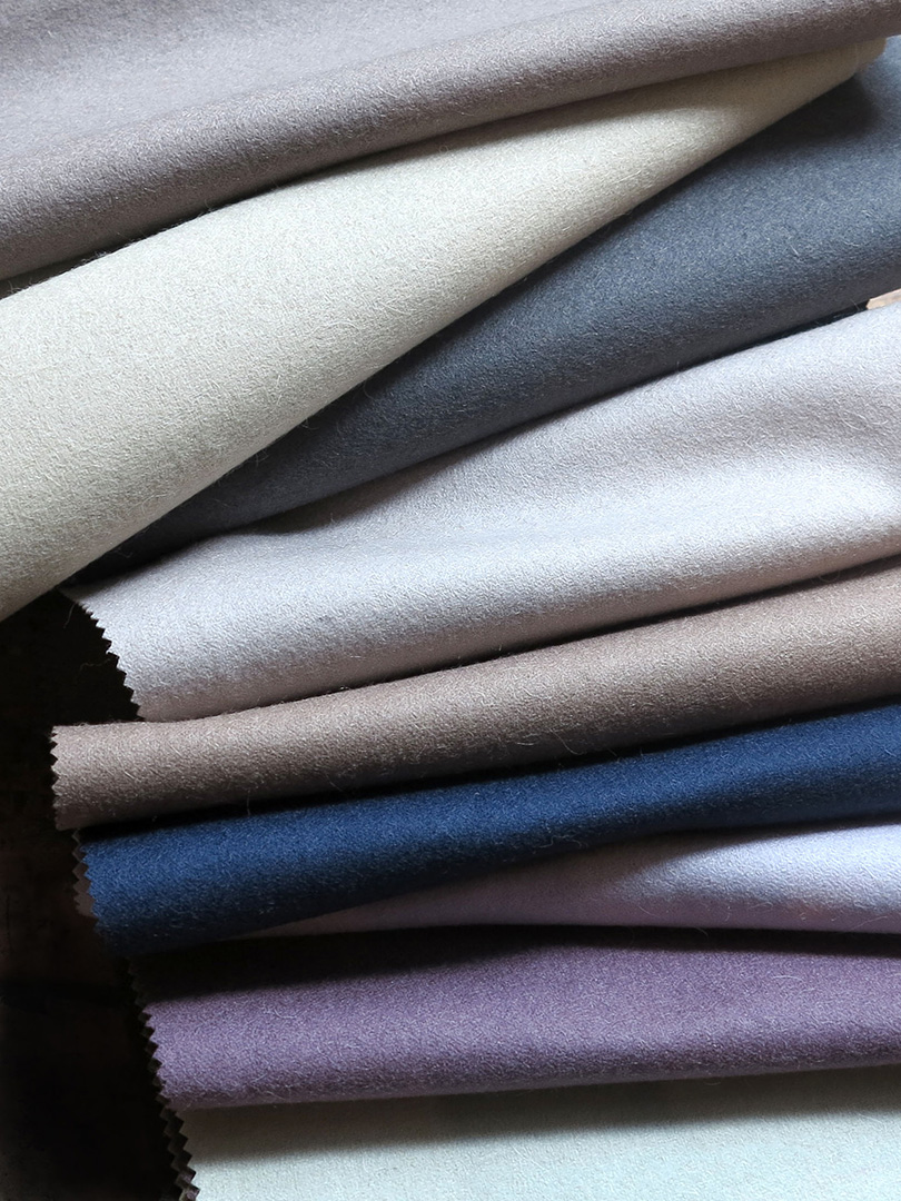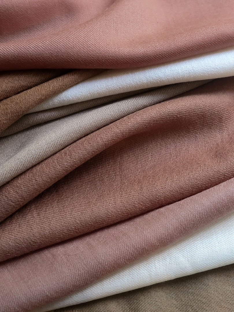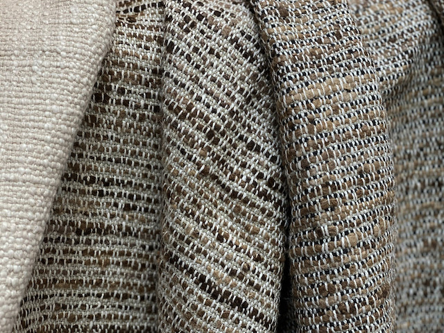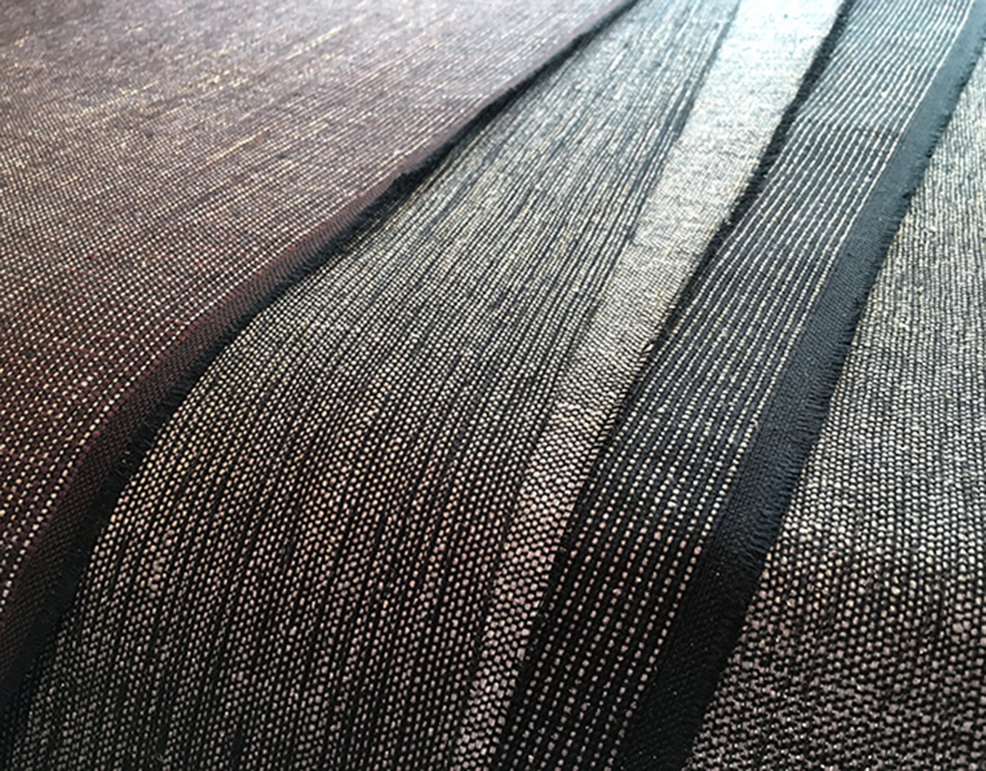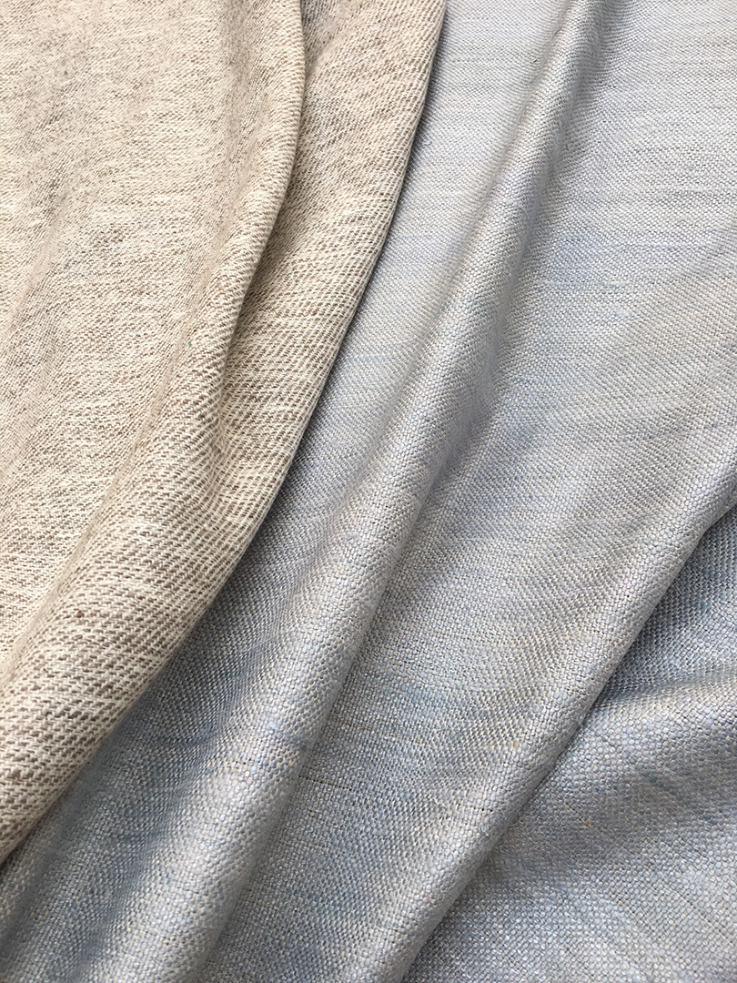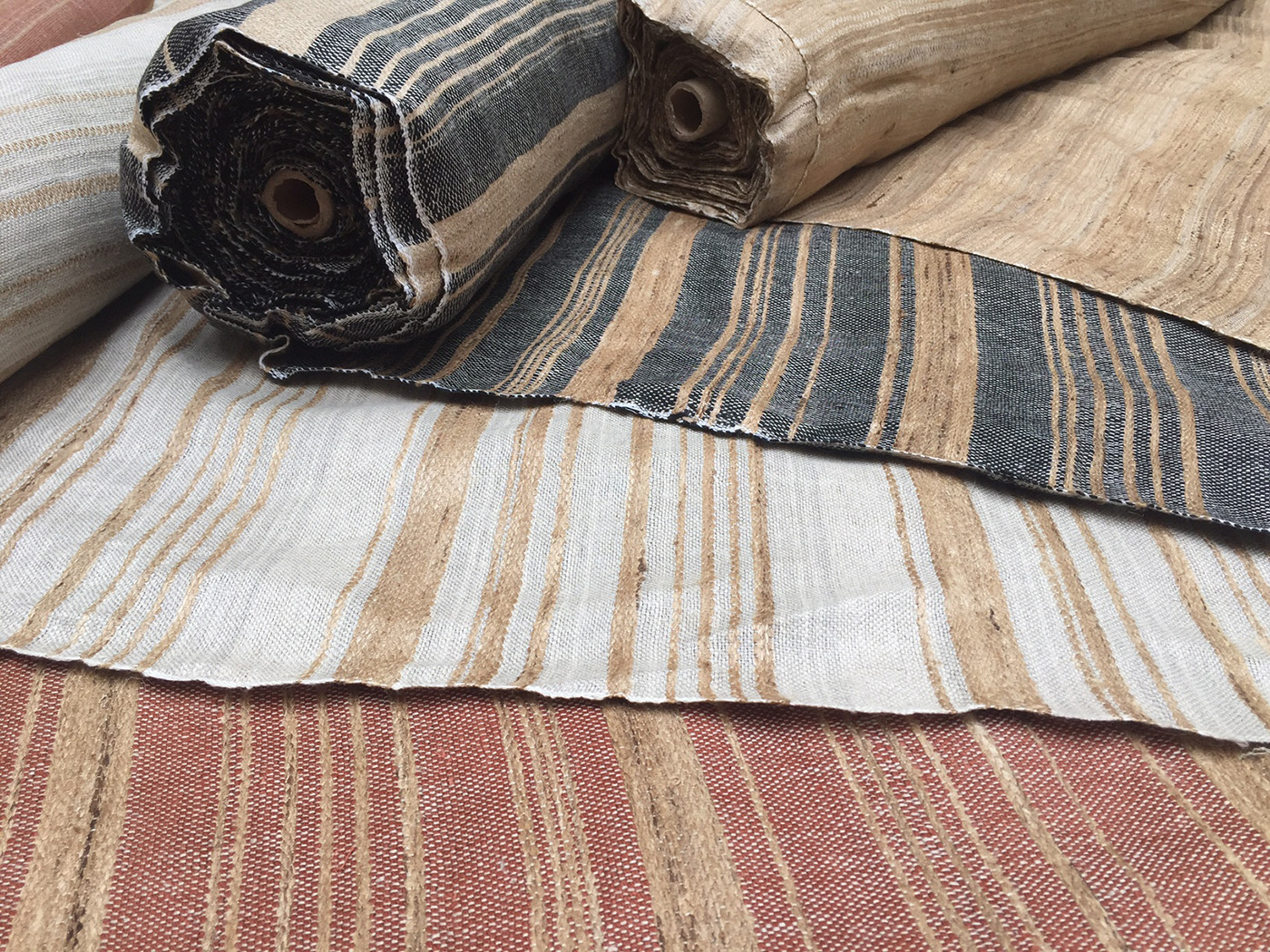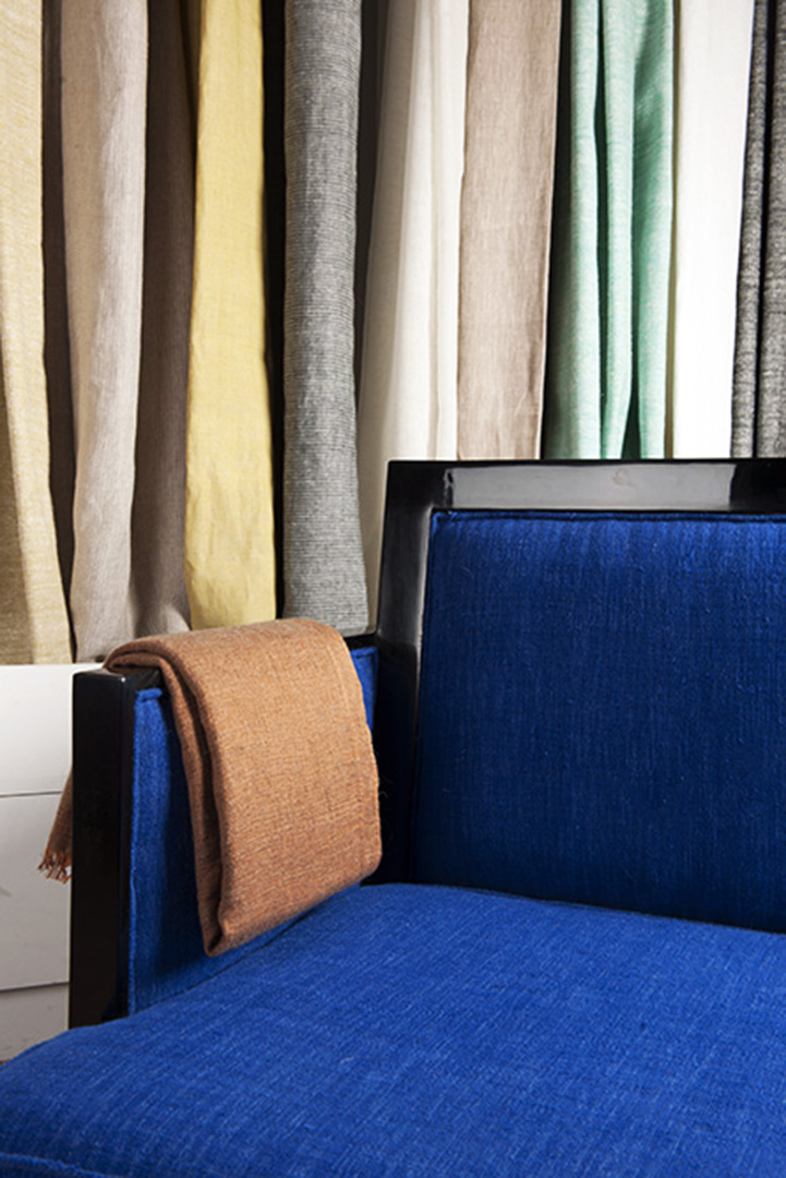 Les tissus en collection sont tissés-main à la commande. Leurs couleurs, densités et armures peuvent être adaptées aux besoins des projets